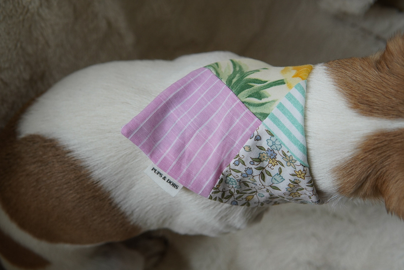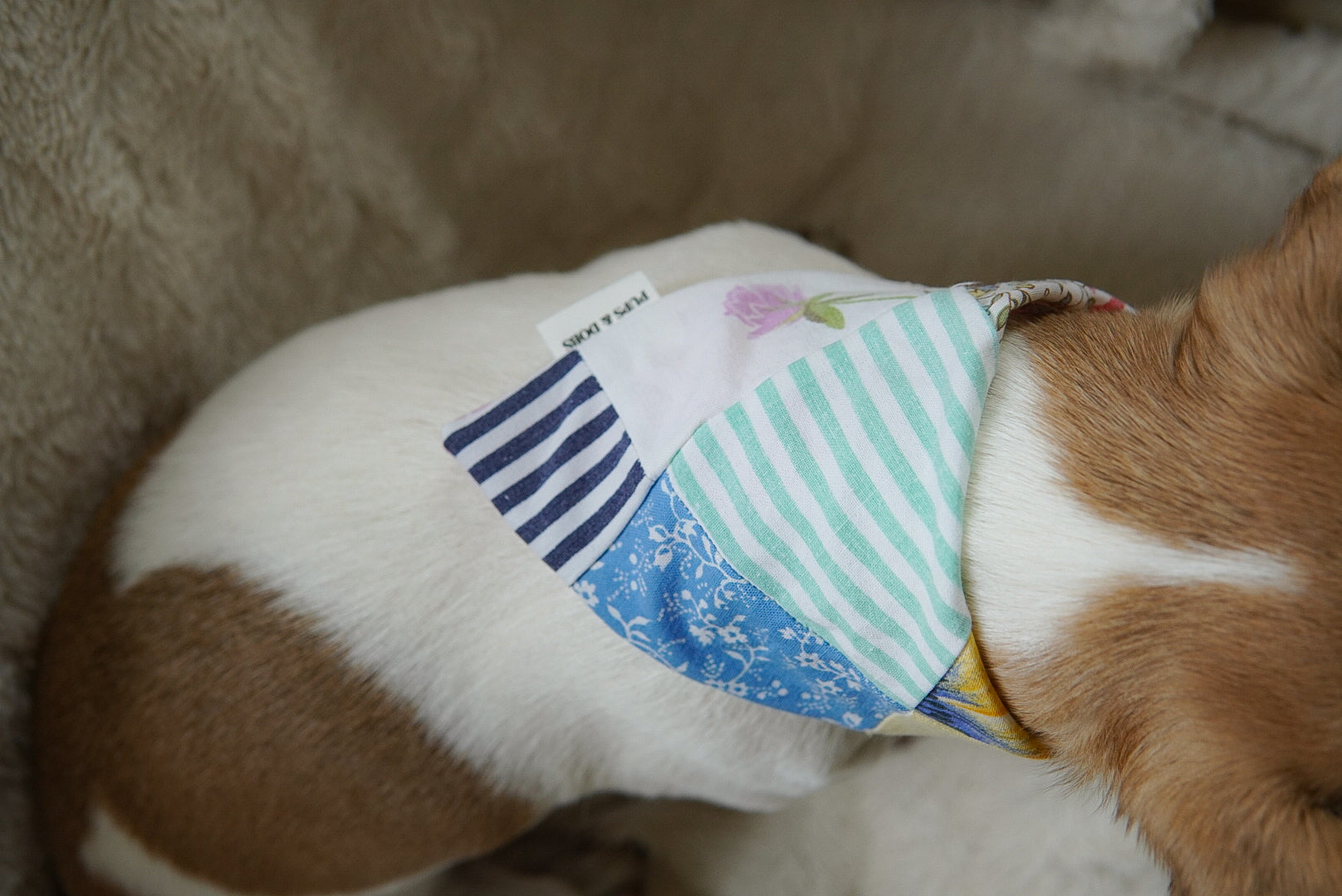 Alla våra bandanas är handgjorda i Finland. Våra bandanas är gjorda med en scrunchie-del i nacken. Scrunchie-delen innehåller ett elastiskt band, som gör bandanan mer flexibel och gör det enkelt för din hund att bära utan att behöva ha ett halsband.