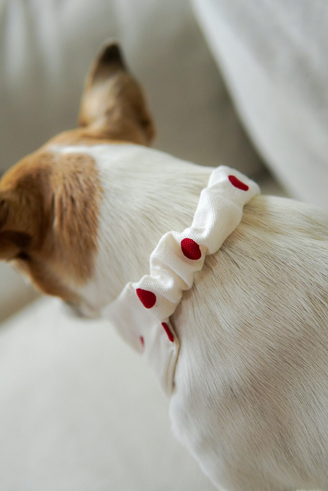 Alla våra bandanas är handgjorda i Finland. Våra bandanas är gjorda med en scrunchie-del i nacken. Scrunchie-delen innehåller ett elastiskt band, som gör bandanan mer flexibel och gör det enkelt för din hund att bära utan att behöva ha ett halsband.