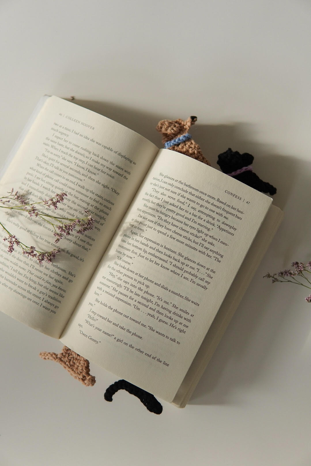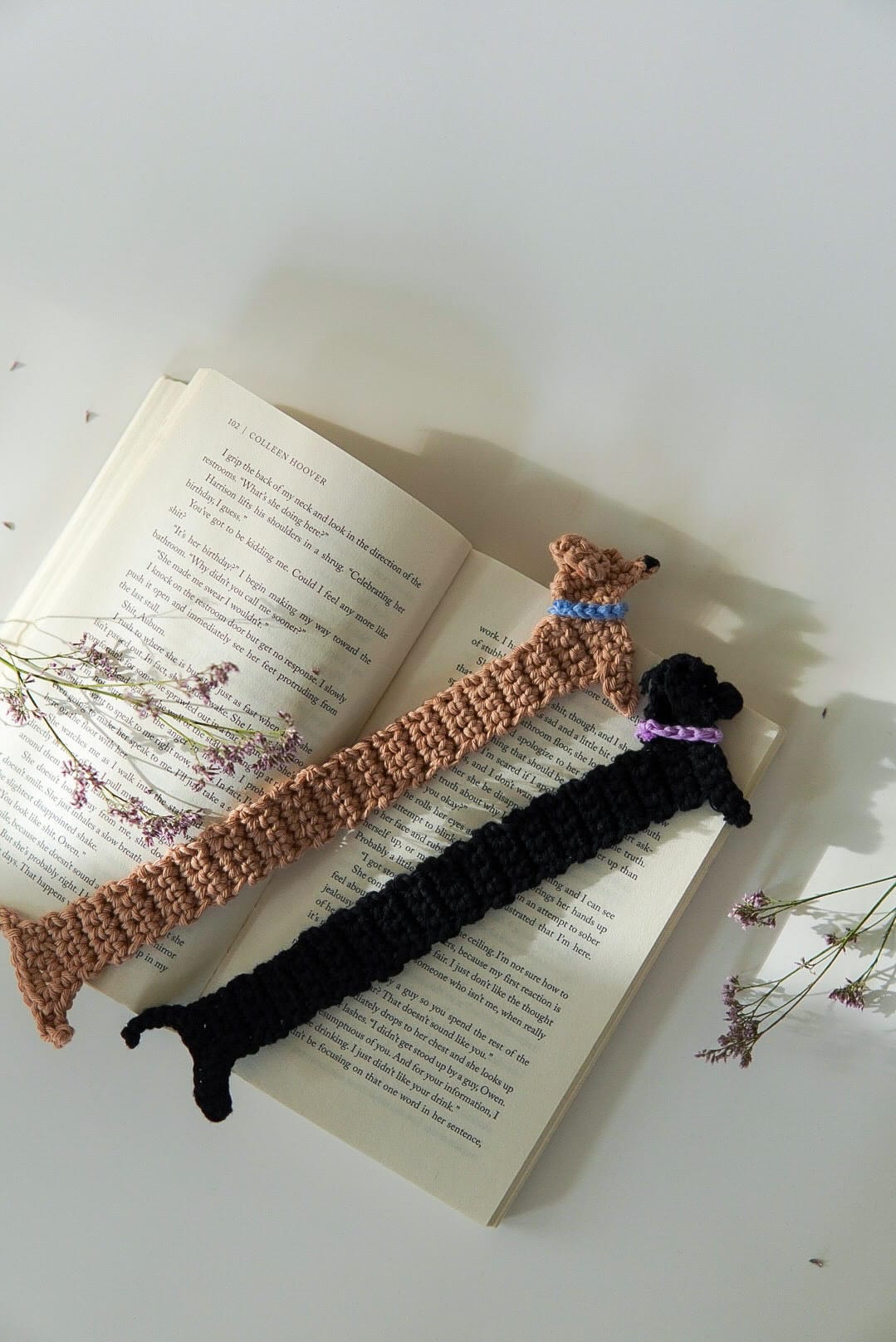 Våra virkade hundbokmärken finns i två olika färger, Svart & Beige.