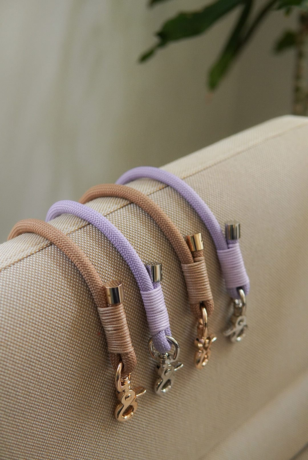 Snygga alternativ: Finns i två färger, beige med guld detaljer & lila med silverdetaljer. Vårt koppel ger en trendig och söt touch till både dig och din hunds outfit.