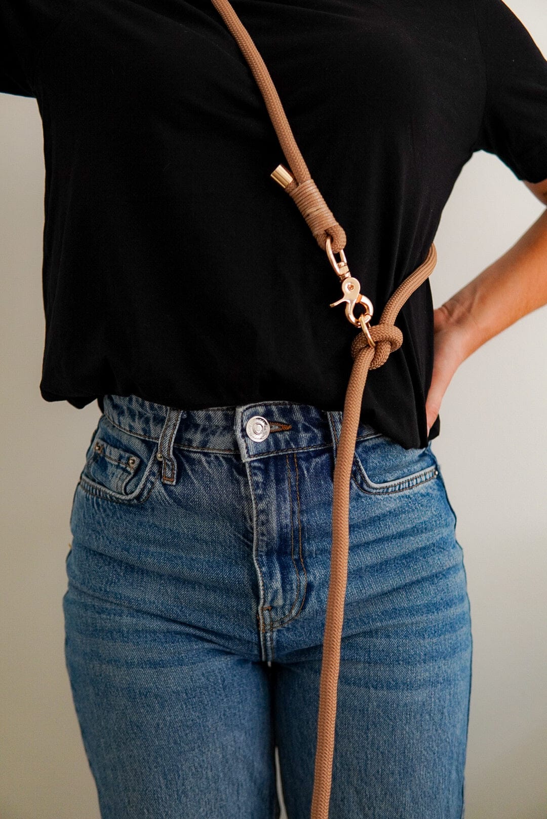 Mångsidig design: Det justerbara repkopplet kan bäras runt midjan eller axeln, eller användas som ett vanligt koppel. Den har två justerbara O-ringar.